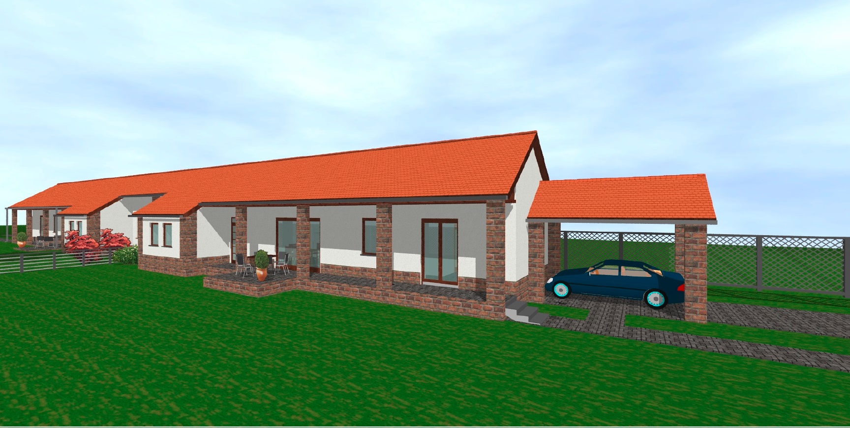 -115m2-es, modern, földszintes épület fedett kocsibeállóval, hangulatos tornáccal