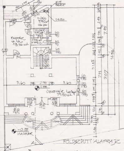 A földszinten található 60nm-es eladótér és 60nm-es raktárhelyiség étkezővel, az irodahelyiség valamint az öltöző zuhanyzóval.