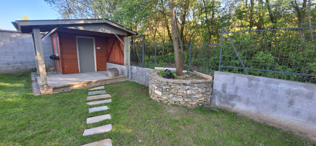 A telket cserjék, akácfák és egy almafa díszíti, füvesítése folyamatban van. Az udvar hátsó részében faház-tároló kapott helyet, a parkolás pedig 3 autónak alkalmas fedett beállón megoldott.