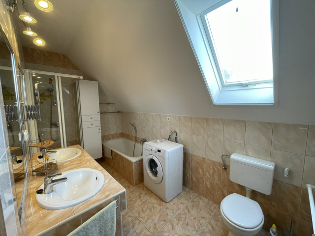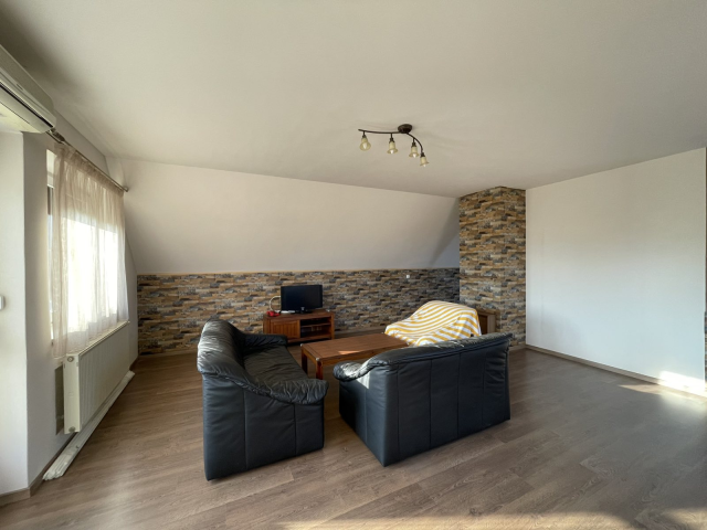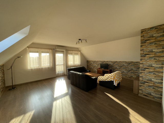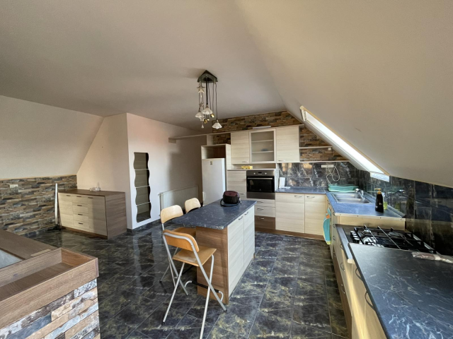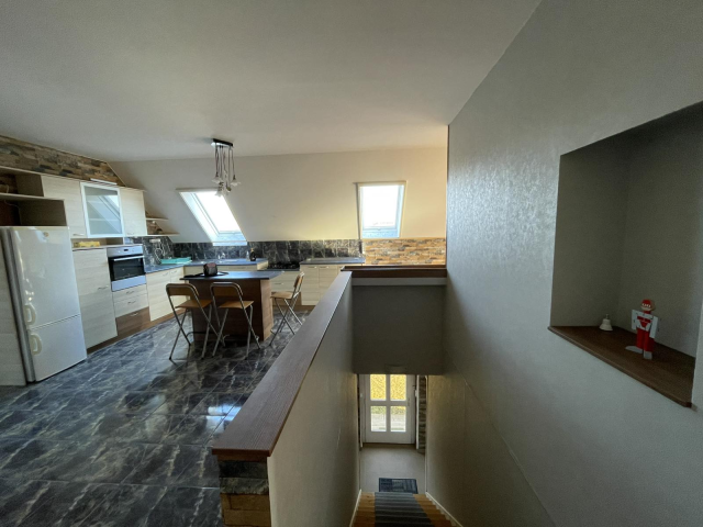 A tetőtérben egy légterű nappali-ebédlő (40 m²) és 22 m²-es álomkonyha, valamint két hálószoba (2 X 12 m²), fürdőszoba (9 m²), kamra, illetve gardrób található. A konyha új, egyedi tervezésű bútorral, illetve gépesítéssel (pult magasságban elhelyezett elektromos sütővel és gáz főzőlappal) rendelkezik.