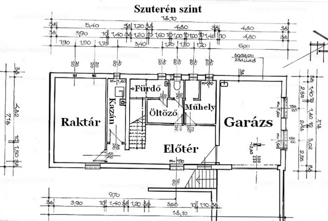 A központi fűtésű, mindenütt ablakos, 110 m²-es szuterénben garázs, műhely, raktár, kazánház, előtér, fürdő és WC helyiségek vannak. A szuterénben könnyen kialakítható szauna és jakuzzi, illetve szinte kívánkozik a felső kertbe egy impozáns fürdőmedence.Az épület szabadonálló, széles betonjárdán körbejárható. Fő tájolása dél-délkeleti.